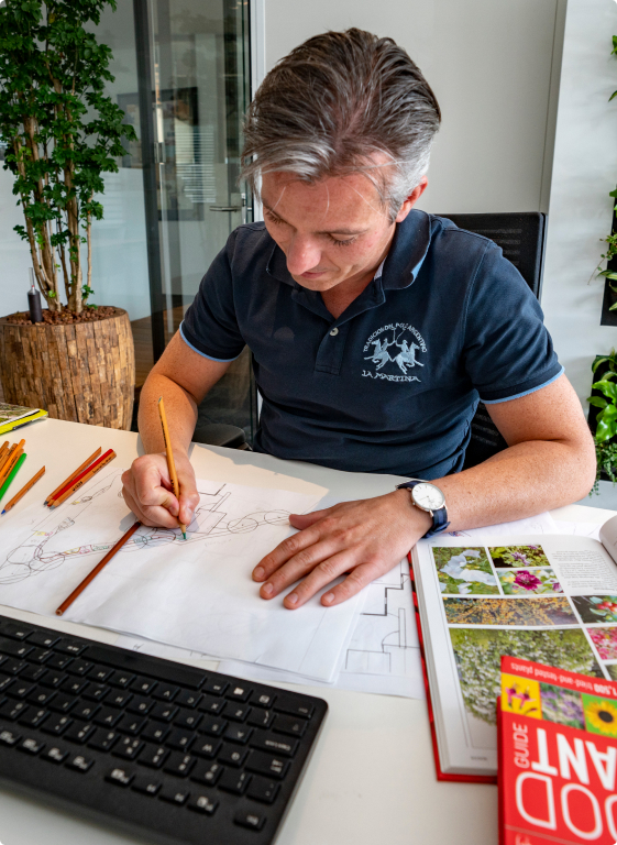So we do not hire outside forces. One of these designers is Ramon. After a conversation with you, he makes a complete 3d design of your garden. When you then visit us for coffee, we present your 3d design with corresponding materials (stone, wood etc) and color samples. This way your garden literally comes to life in our presentation room.